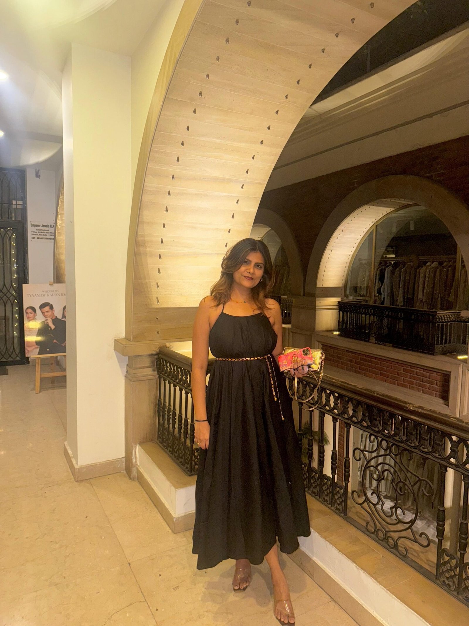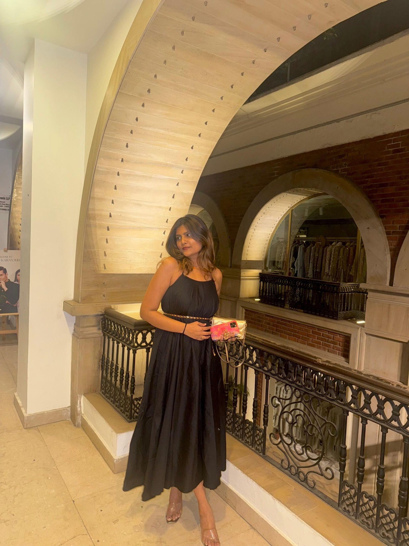 This dress is a sleek and elegant black midi dress with a timeless, minimal design. Here’s a detailed breakdown: