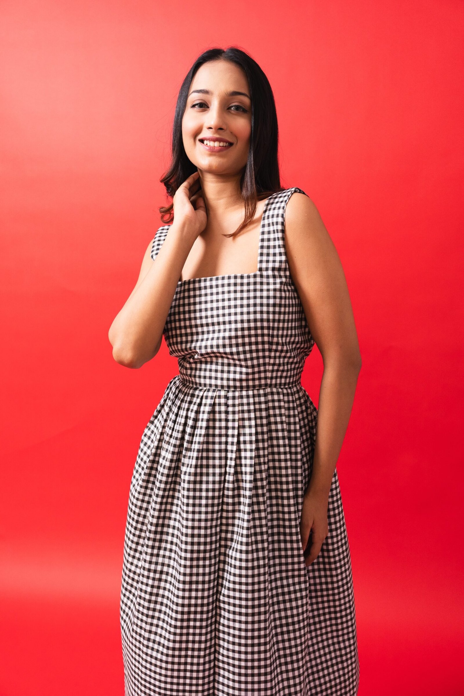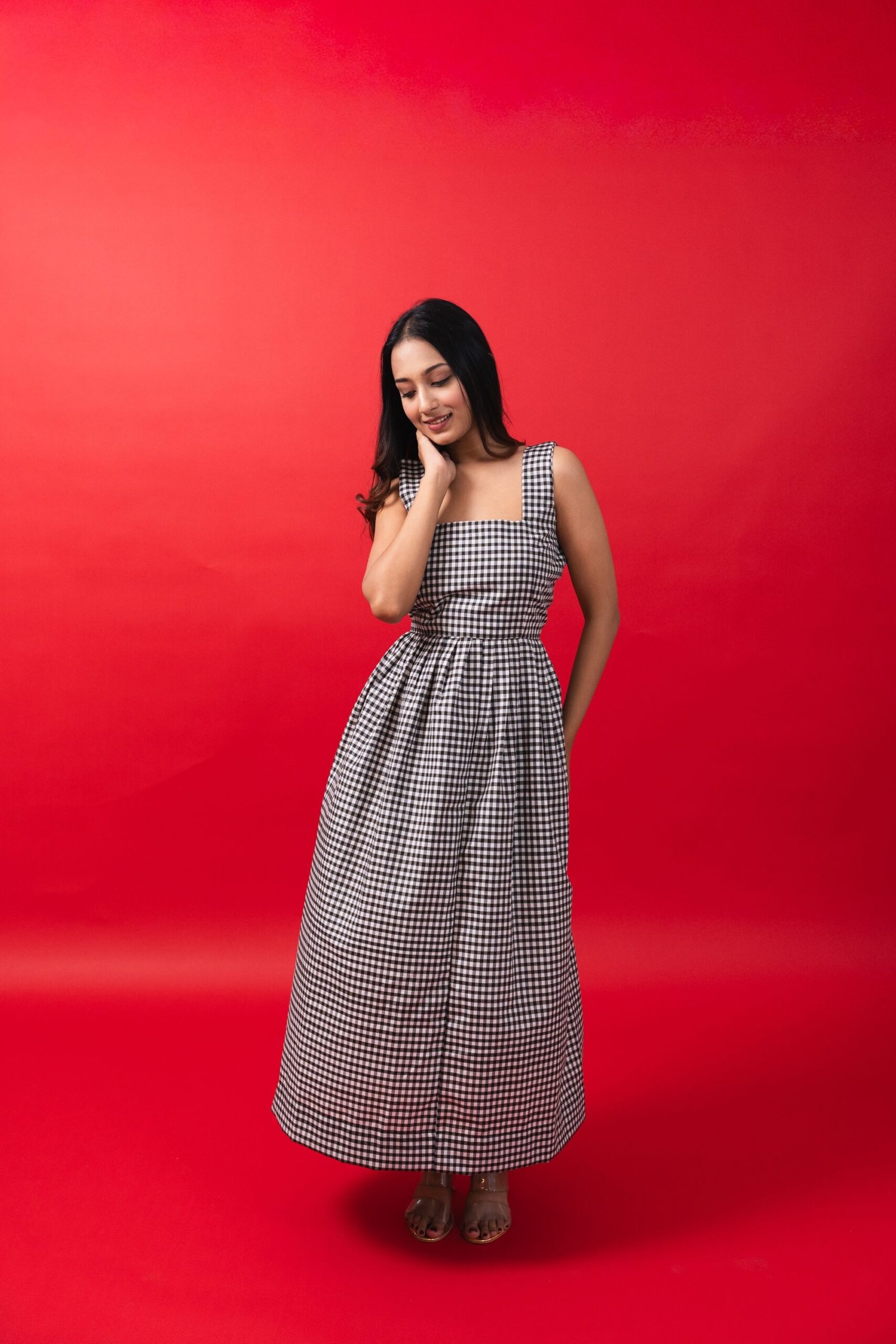 This Monochrome dress checkered dress is made with soft cotton fabric to make you feel comfortable all day.Whether you're heading to a dinner date, a cocktail party, or a special evening out, this dress ensures you stand out with grace. The flowy silhouette and rich color create a bold yet sophisticated look, perfect for any occasion that calls for a touch of glamour.Pair it with minimal jewelry and strappy heels for a refined look, or add a clutch and bold lips for a more dramatic appeal. This dress is all about embracing your elegance with confidence and style!Additional information
